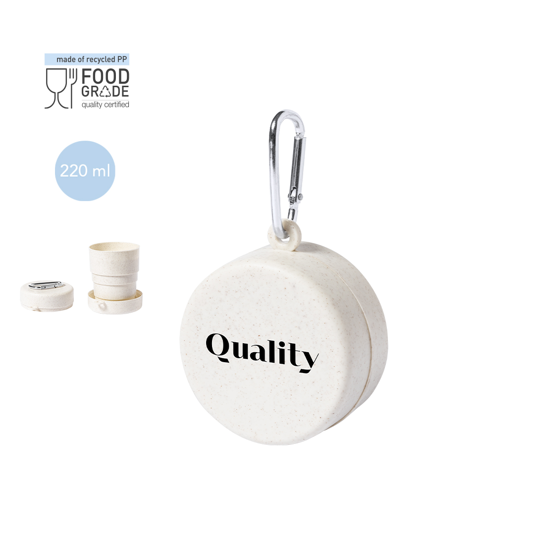 Originale bicchiere pieghevole per le emergenze in PP venato senza BPA. Capacità 220ml, con moschettone in metallo per il trasporto. Certificazione Food Grade, che garantisce la sicurezza dellarticolo al contatto del cibo con il materiale utilizzato per la fabbricazione del prodotto.